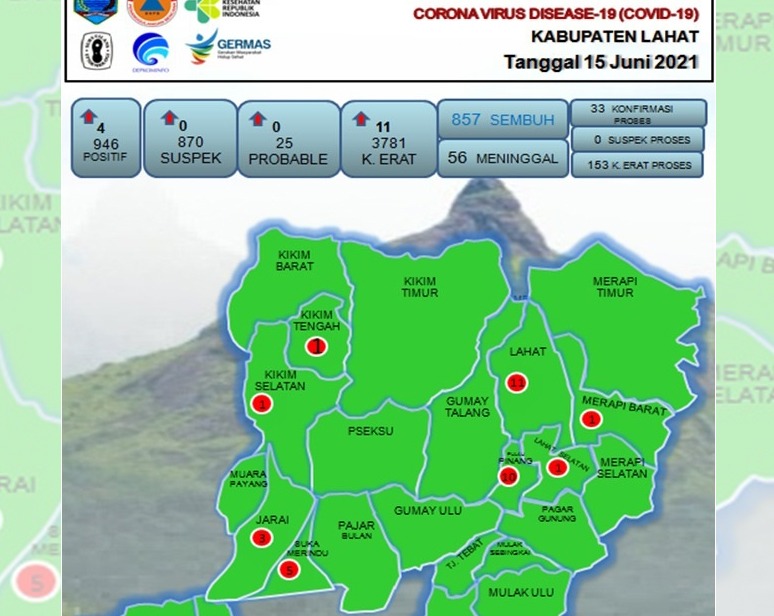 “Titik warna merah dalam peta perkembangan Covid-19 Lahat itu artinya konfirmasi dan warna kuning bermakna suspek. Jadi, hari ini ini tidak ada yang Suspek dan terkonfirmasi positif corona tercatat 33 orang,” jelasnya, Selasa (15/6/21).