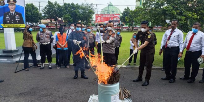 LUBUKLINGGAU, gemasriwijaya.net – Kapolres Lubuklinggau AKBP Indra Arya Yudha memimpin langsung pemusnahan Barang Bukti (BB) narkotika jenis ganja. Pemusnahan BB dengan cara dibakar tersebut bertempat di depan halaman Mapolres Lubuklinggau, Rabu (30/8/23), Pk.10.00 Wib.