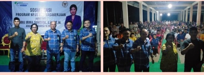 LAHAT, Gemasriwijaya.net – Bertempat di pasar rakyat desa Geramat kecamatan Mulak Ulu Kabupaten Lahat Sumatera Selatan. Sabtu malam (3-2-2024). BPJS ketenagakerjaan kabupaten lahat mensosialisasikan program ketenagakerjaan untuk masyarakat. Sosialisasi BPJS ketenagakerjaan ini dihadiri oleh Irma Suryani SE.MM. Anggota DPR-RI Komisi IX dari partai Nasdem, Caleg DPRD kabupaten lahat Indi Ipriadi dari partai Nasdem, Anggota Polsek Mulak ulu. Seperti disampaikan Muhammad Irwan Nasir Nawawi kepala cabang BPJS Ketenagakerjaan kabupaten lahat, bahwa pentingnya BPJS ketenagakerjaan bagi masyarakat yaitu, santunan kecelakaan kerja, transportasi darat, laut dan udara, santunan kematian, santunan berkala dan biaya pemakaman, dan banyak lagi program lainnya. Dikatakan Irwan adapun iuran bulanan untuk BPJS ketenagakerjaan ini sebesar Rp 16.800,00,