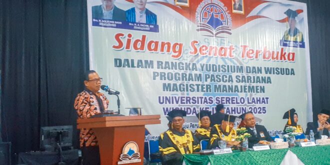 LAHAT – Bupati Lahat yang dalam hal ini diwakili Asisten II M. Ichsan Fadli, S. IP, MM, menghadiri Sidang Senat Terbuka dalam rangka Yudisium dan Wisuda Program Pasca Sarjana Magister Manajemen Universitas Serelo Lahat (Unsela) Wisuda ke-4 Tahun 2025, yang dilaksanakan pada Kamis (24/7/25) di Aula Universitas Serelo Lahat.