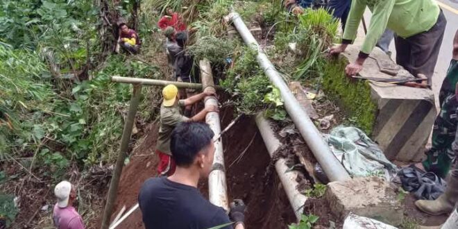 Menyikapi kondisi darurat ini, warga desa menunjukkan semangat gotong royong yang tinggi. Sejak longsor terjadi, puluhan warga terlihat bahu-membahu melakukan perbaikan darurat pada jalur pipa air milik PDAM yang putus dan rusak tertimbun material longsor. Aktivitas perbaikan tersebut dilakukan secara manual dengan peralatan seadanya.